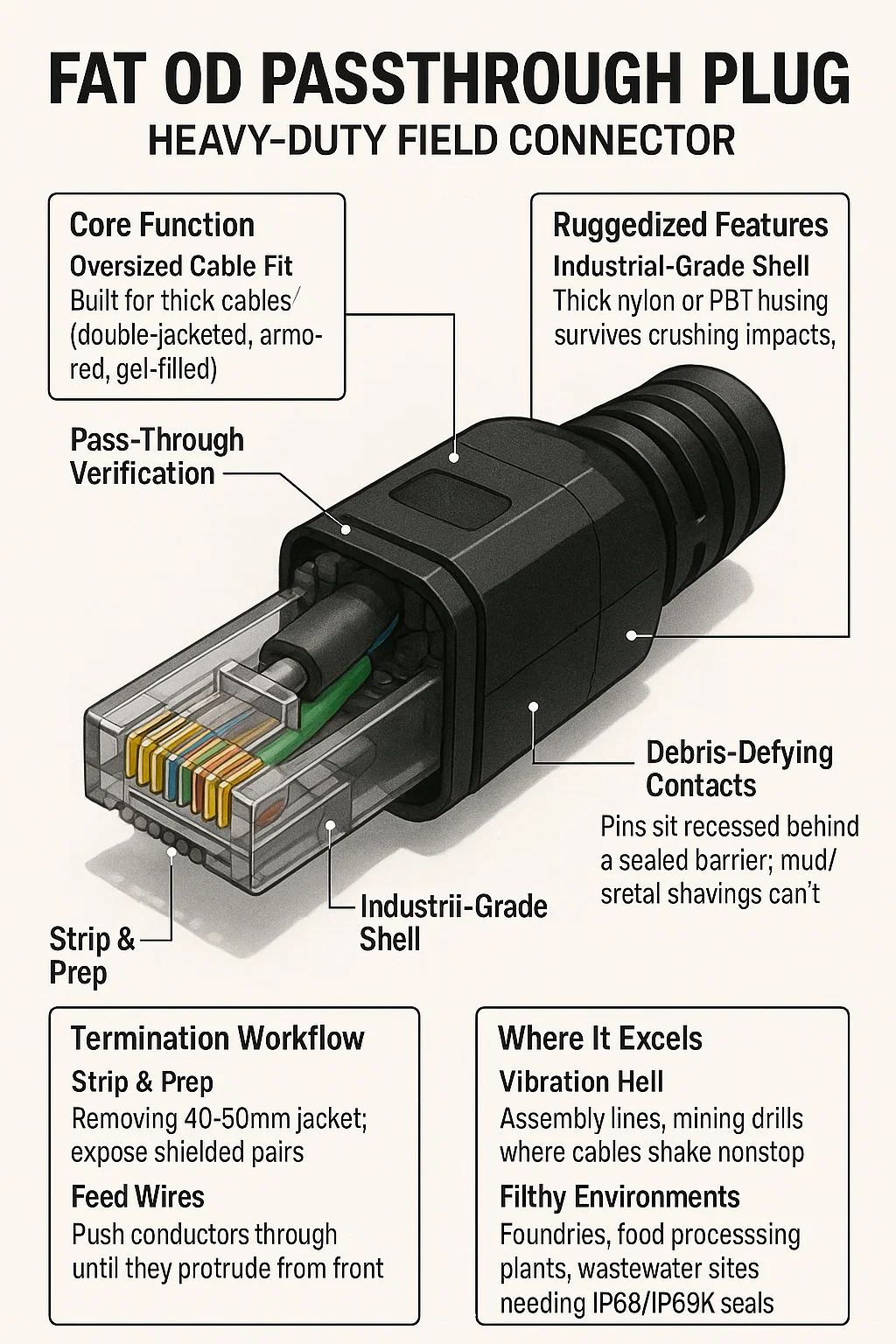 特大ケーブルフィット: 標準プラグには適合しない太いケーブル (二重ジャケット、外装、ゲル充填) 用に設計されています。