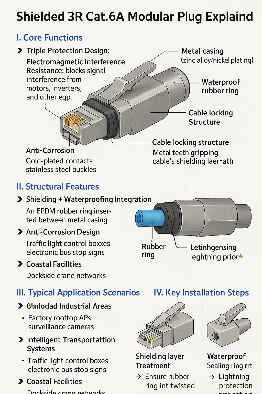 EPDM ゴム リングが金属ケースの端に埋め込まれており、圧着後のシールド接地と IP54 防滴保護の両方を提供します。